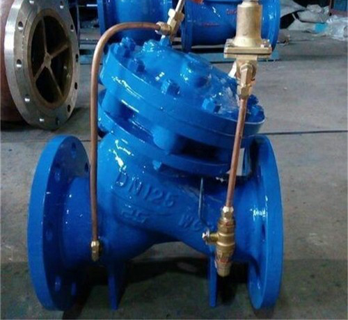 當管道從進水端給水(shuǐ)時(shí),水流(liú)過針閥進入(rù)主閥控製室,出口壓力通(tōng)過導管作用到導閥上,高於導閥設定值時,導閥(fá)關閉(bì),控製室停止排水,此(cǐ)時主(zhǔ)閥控(kòng)製室內壓力升(shēng)高並關閉主閥,出口壓力(lì)不再升(shēng)高。